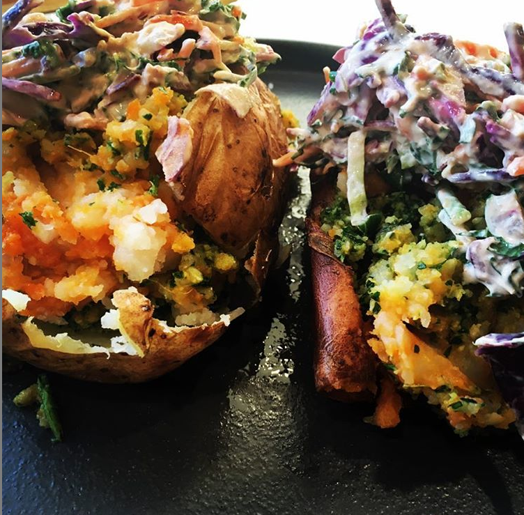 Jacket Potatoes with Spicy Slaw and Homemade Pesto